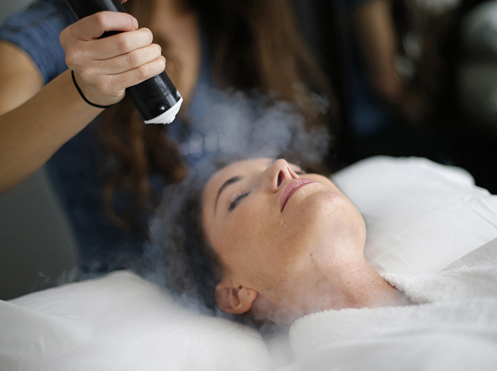 Application de la Cryo faciale à travers un jet de froid combinée à un masque oxygénant.